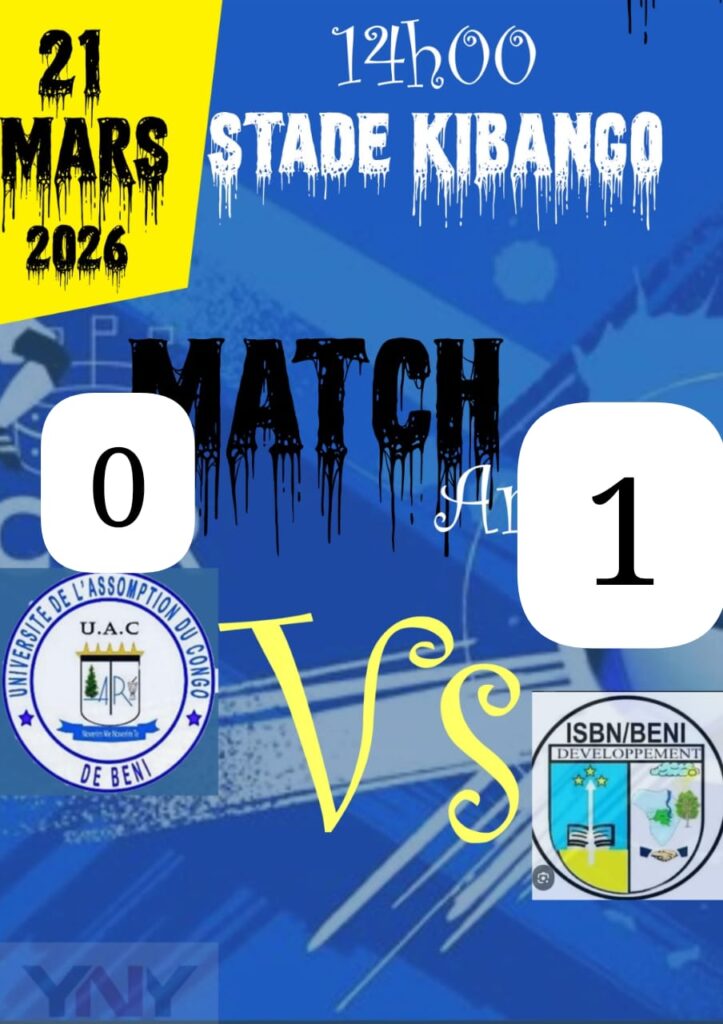 L’Institut Supérieur du Bassin du Nil (ISBN/Beni) a remporté une victoire étriquée mais importante face à l’Université de l’Assomption au Congo (UAC/Beni) sur le score de 1 but à 0, lors d’un match amical disputé ce samedi 21 mars 2026 au stade de Beni Sport, communément appelé stade de Kibango.