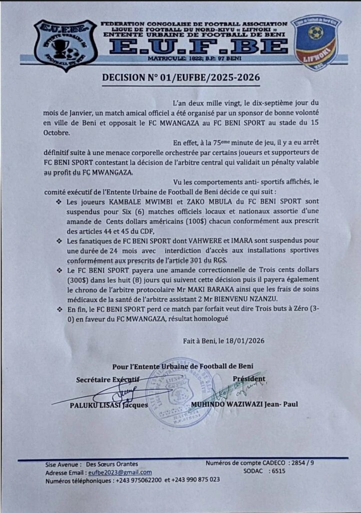 Mais malgré cette victoire, l’Entente Urbaine de Football de Beni (EUFBE) a pris des mesures disciplinaires à l’encontre du FC Beni Sport, suite aux incidents survenus lors du match contre le FC Mwangaza.