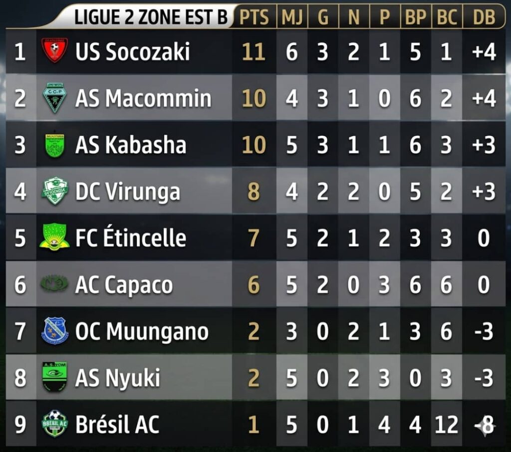 À l’inverse, ce résultat fait les affaires de l’US Socozaki, qui prend la tête du classement provisoire avec 11 points en 6 matchs, devant l’AS Macomin et l’AS Kabasha, qui totalisent chacun 10 points.