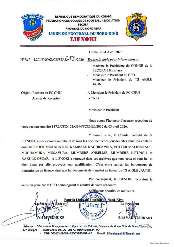 Dans une correspondance officielle datée du 4 avril 2026, l’instance provinciale du football indique avoir procédé à un examen approfondi des dossiers administratifs des joueurs contestés. Il s’agit notamment de Héritier Mukahathe, Kambale Kaghisavira, Potter Malindrale, Muchamuka Musavura, Mumbere Anselme, Mumbere Kitungu et Kakule Oscar.