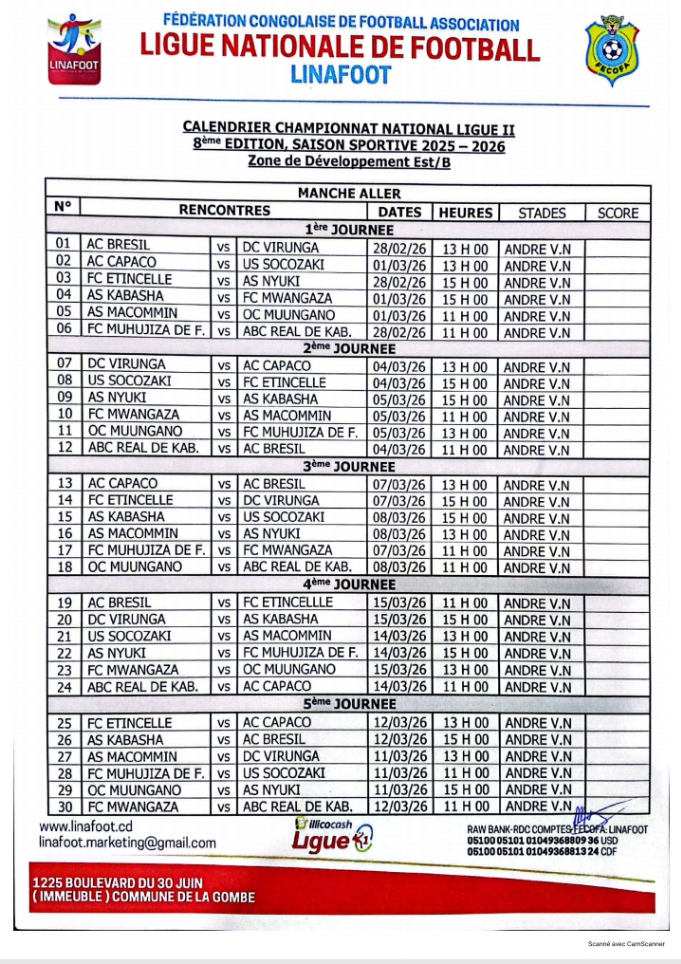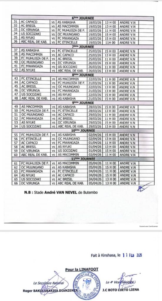Après plusieurs semaines d’attente, la Ligue Nationale de Football (Linafoot) a officiellement rendu public le calendrier de la Ligue 2, Zone Est B. Le championnat débutera le 28 février 2026 au stade André Van Nevel de Butembo.