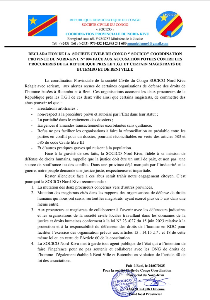 Dans une déclaration officielle référencée N°004 et signée par son point focal provincial, Kasiki Étienne, la SOCICO indique avoir été saisie de plusieurs plaintes faisant état de pratiques jugées abusives de la part de magistrats et des procureurs près les tribunaux de grande instance de ces deux villes.