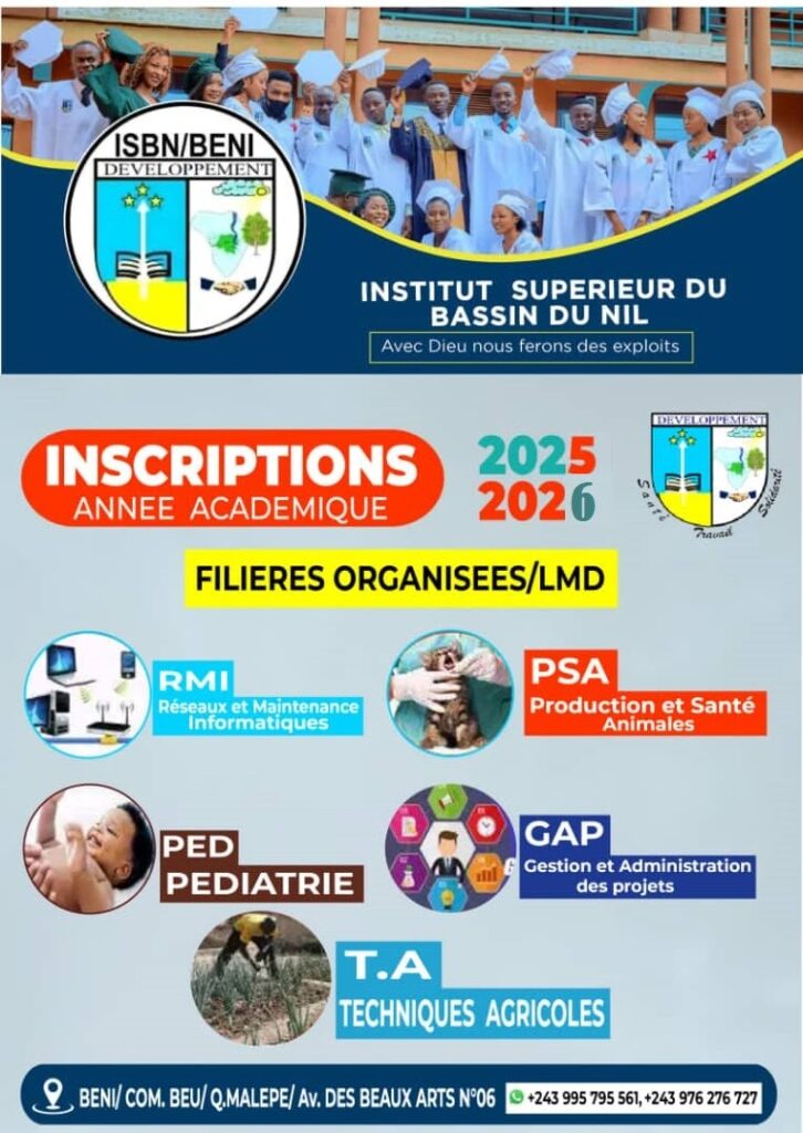 Après une année académique 2024-2025 marquée par des résultats jugés satisfaisants, l’Institut Supérieur du Bassin du Nil (ISBN/Beni) annonce l’ouverture officielle des inscriptions pour l’année académique 2025-2026.
